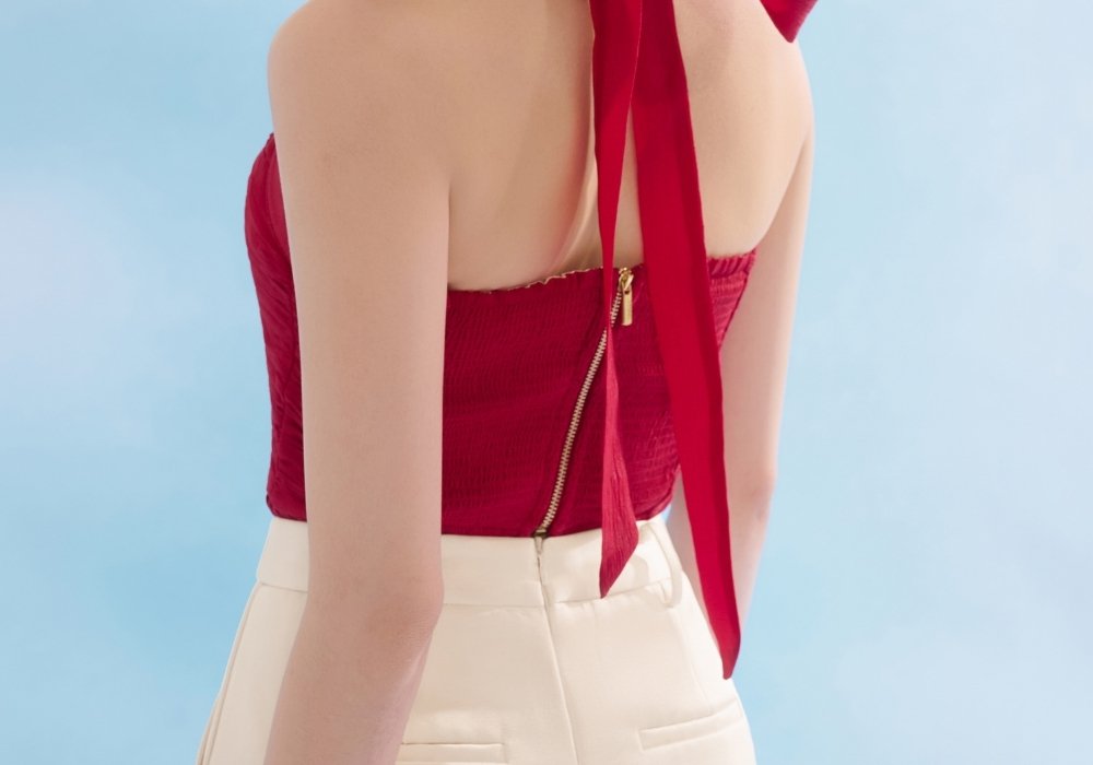 Anya is a halter top with a defined waist and soft peplum hem. The pleated bodice adds structure through the torso, while the peplum creates a flattering shape over the midsection. Finished with a ribbon tie and smocked back for comfort and adjustability. Easy to pair with skirts or tailored shorts.
