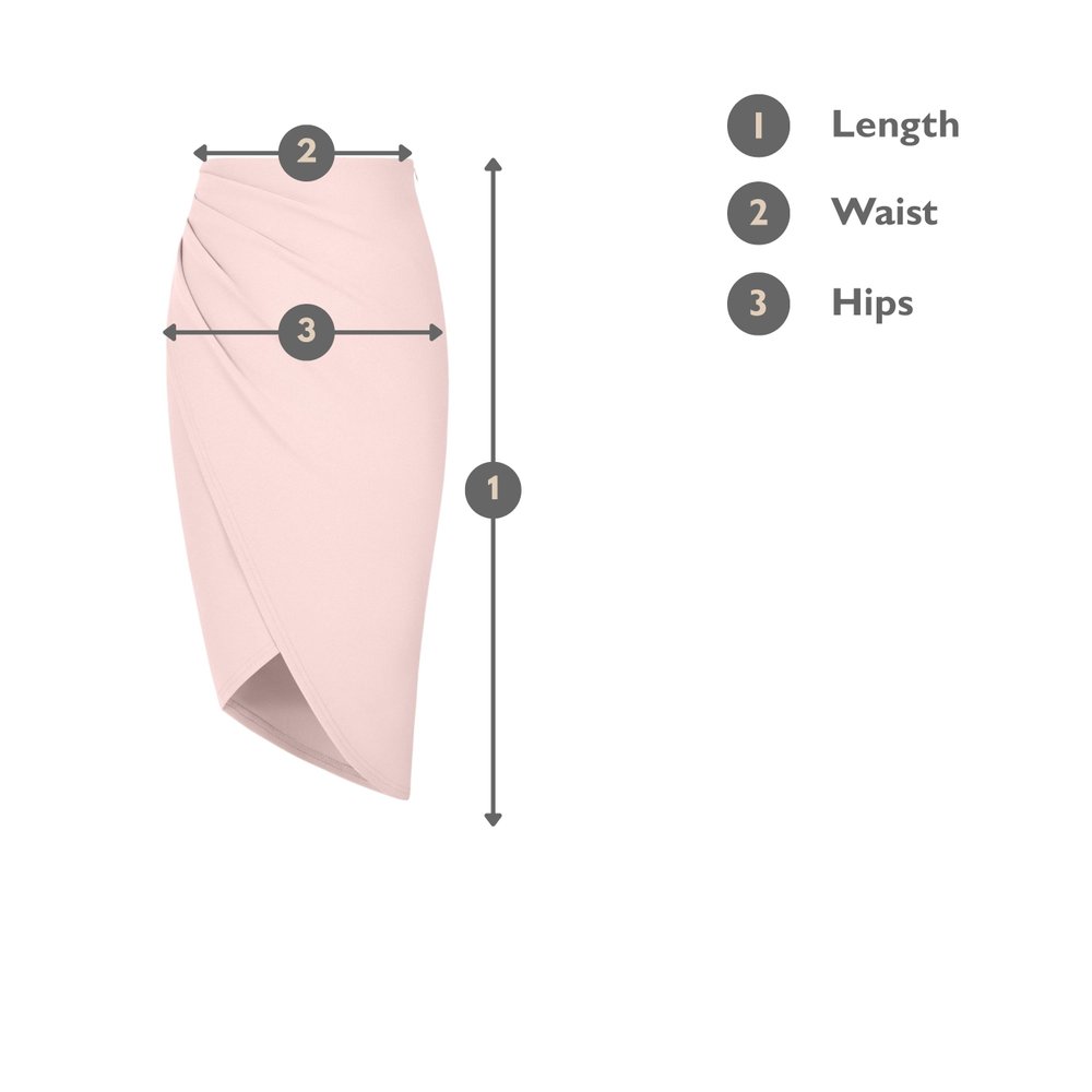 High waisted and crafted from bonded crepe fabric, it hugs your curves while remaining stretchy and taut, ensuring a flattering fit every time. The ruches along the sides and double layer wrap help conceal any bulges and provide you more compression, giving you a sleek and polished look. With its asymmetrical hemline, this skirt creates an hourglass silhouette that exudes confidence and allure.