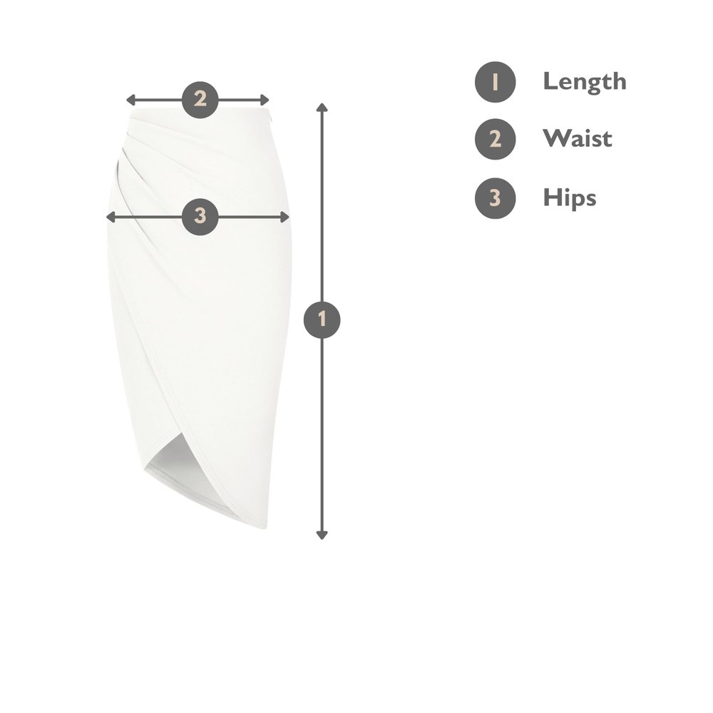 High waisted and crafted from bonded crepe fabric, it hugs your curves while remaining stretchy and taut, ensuring a flattering fit every time. The ruches along the sides and double layer wrap help conceal any bulges and provide you more compression, giving you a sleek and polished look. With its asymmetrical hemline, this skirt creates an hourglass silhouette that exudes confidence and allure.