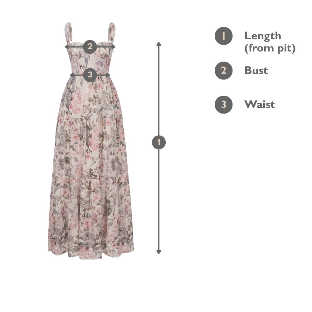 Our Calla Bustier Tiered Maxi Dress, adorned with a garden's worth of blooming flowers, exudes romantic charm.