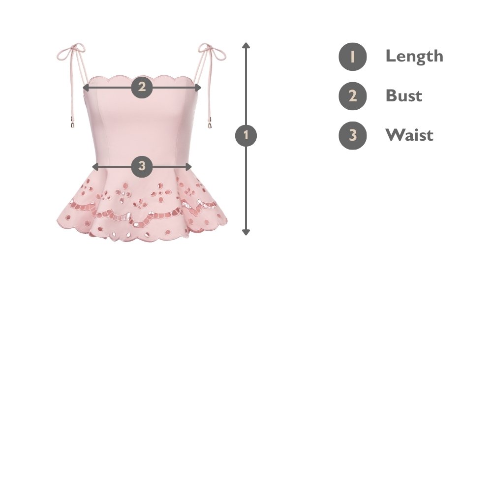 Cecily Ribbon Tie Embroidered Scallop Peplum Top is a charming blend of style and versatility, perfect for elevating any look effortlessly. The fixed self-tie ribbons ensure a secure fit while adding a playful yet polished touch, enhanced by metal ends for a sleek finish.