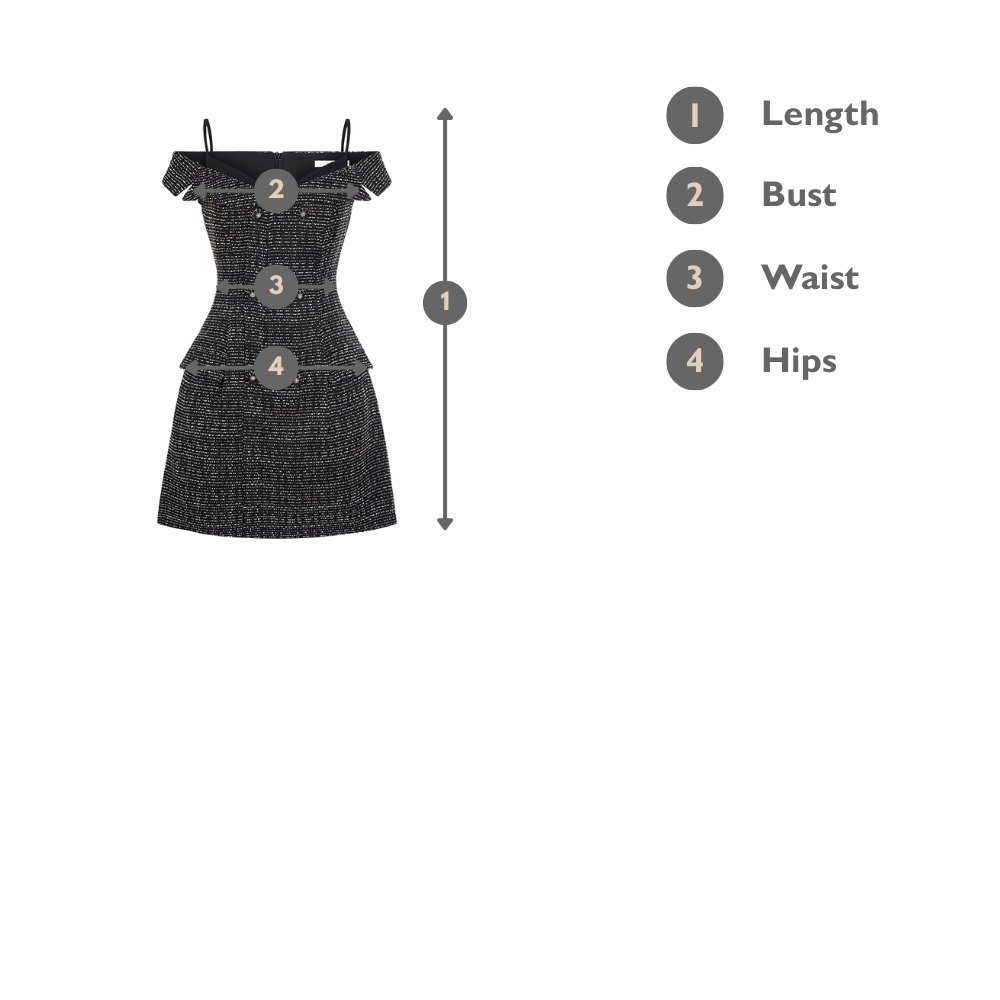 The Chaerin Off Shoulder Mini Dress blends modern poise with classic elegance. Made from high quality tweed that holds its structure beautifully while being low maintenance, this piece is an elevated essential for any wardrobe. The off shoulder design and adjustable straps offer a flattering, secure fit while drawing attention to the collarbones. Delicate bejewelled buttons add a luxurious sparkle, and the sculpted waistline flatters your figure effortlessly. With its unique neckline panel detail that gives the illusion of a two-piece, this dress is a great option for both day-to-night transitions and special events.