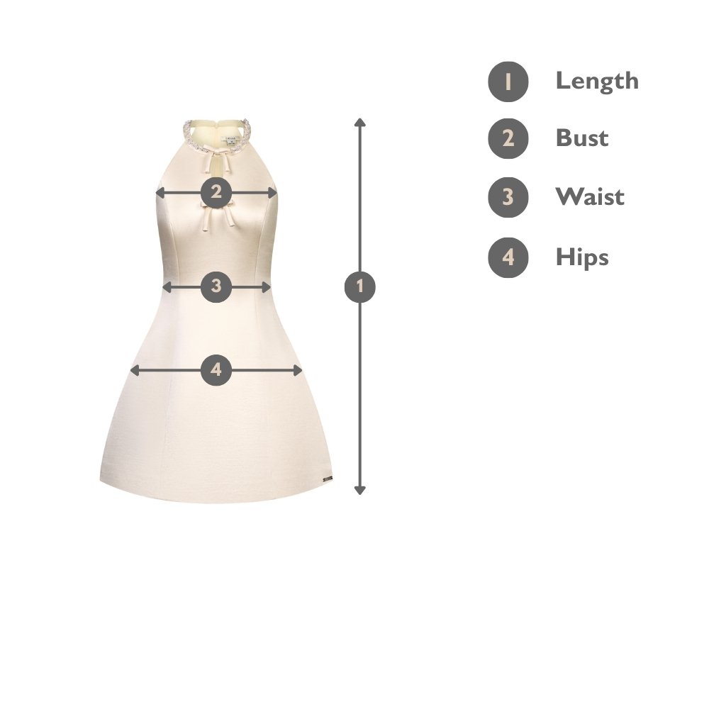 Cupid is a padded statement mini with a sculpted, confident silhouette. The bejewelled halter neckline draws attention upward, eliminating the need for accessories, while the fitted waist creates a clean hourglass line. Pockets add practicality without breaking the look. A bold yet refined piece for standout moments.