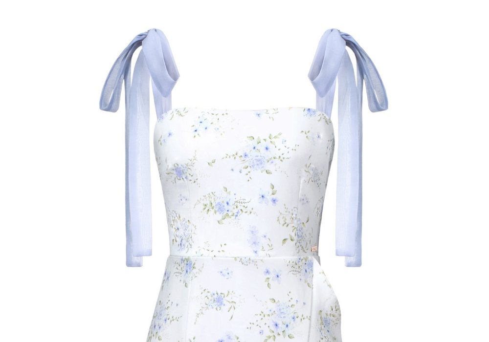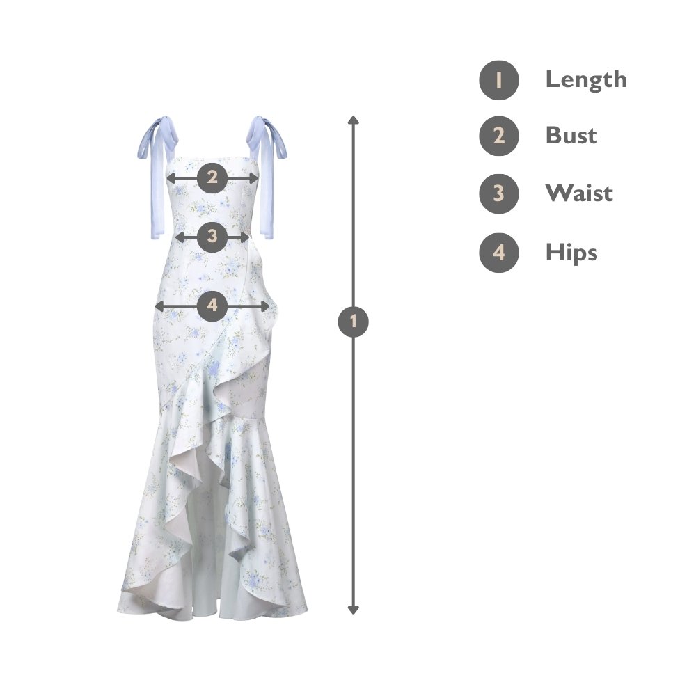 Everlee is a fitted maxi with elegant movement through the hem. The mermaid silhouette hugs the body before releasing into soft ruffles that sway with every step. Ribbon straps and a square neckline frame the shoulders and collarbones, while added padding keeps the fit fuss free. A confident, feminine piece that feels fluid rather than rigid.