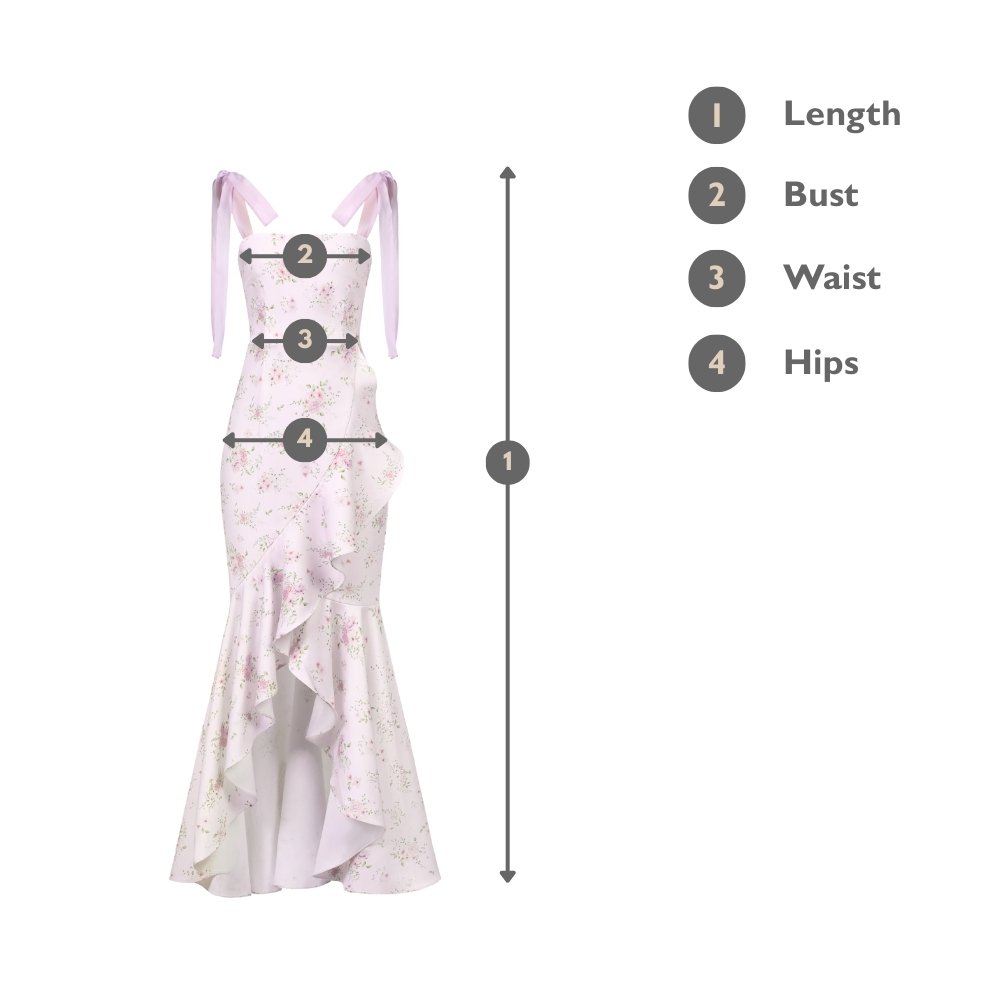 Everlee is a fitted maxi with elegant movement through the hem. The mermaid silhouette hugs the body before releasing into soft ruffles that sway with every step. Ribbon straps and a square neckline frame the shoulders and collarbones, while added padding keeps the fit fuss free. A confident, feminine piece that feels fluid rather than rigid.