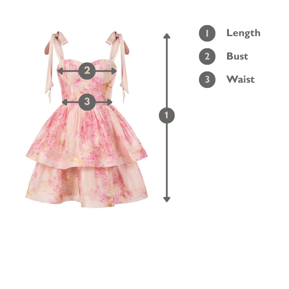 Fiona is a bustier mini dress with a defined, feminine shape. The structured bust cups hold the bodice neatly in place, while a smocked back allows flexibility and comfort. A tiered skirt adds movement without excess volume, keeping the silhouette balanced. Finished with removable ribbon straps so you can adjust the look to suit your styling.