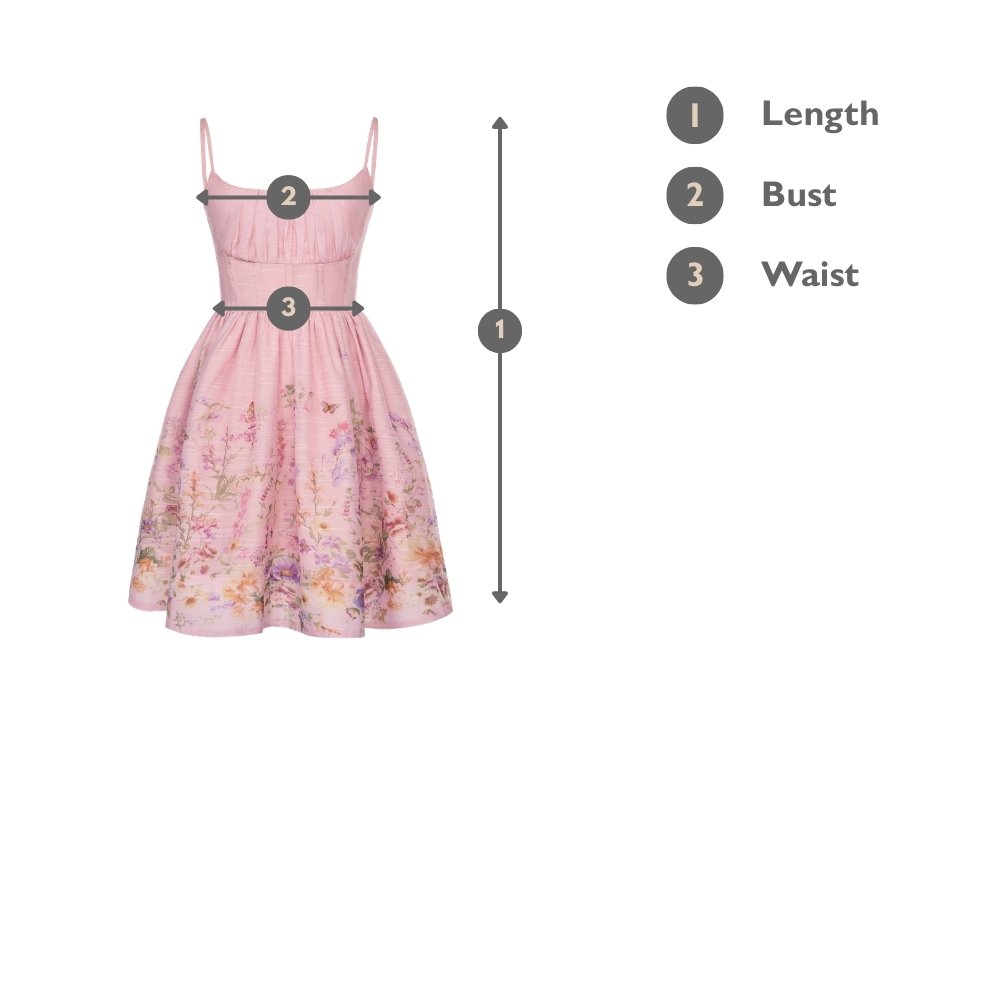 The highlight of this dress is the Enchanted Pastures print, a captivating design that evokes the serene beauty of a flourishing meadow at dawn. Delicate wildflowers in soft lavender, vibrant orange, and lush green tones dance across the fabric, interspersed with fluttering butterflies that bring a sense of movement and life.