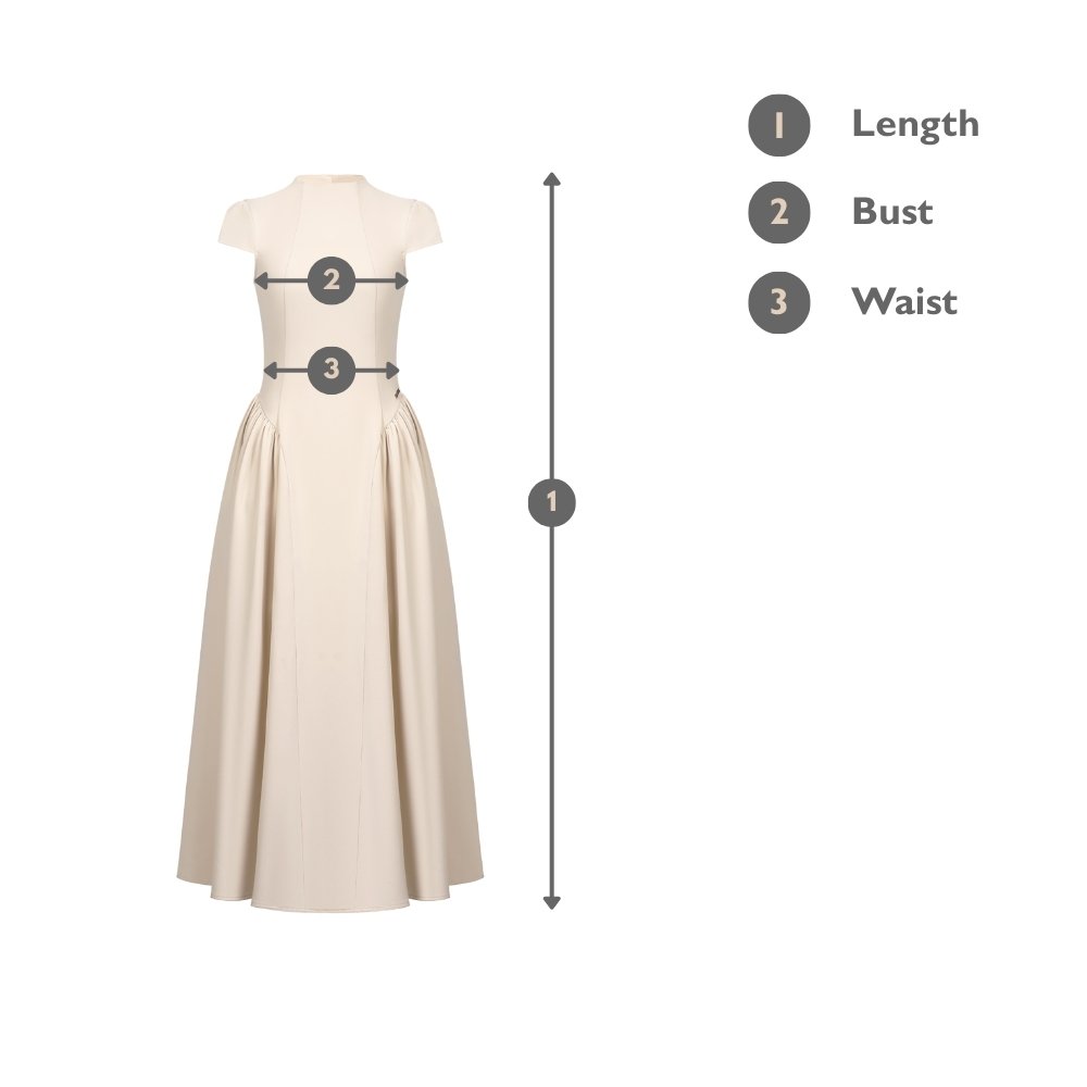 Freya is a graceful padded midaxi that balances structure with softness. The mock neckline and cap sleeves frame the upper body cleanly, while the flared skirt opens into gentle volume with every step. A bare back adds contrast to the otherwise composed front, creating a look that feels refined yet quietly alluring. This is an elegant choice for moments that call for presence without excess.
