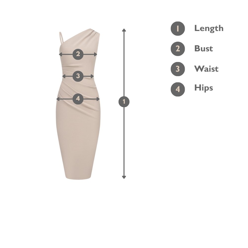 Gaia is a fitted midi dress defined by an asymmetrical neckline and sculpting ruching. The diagonal neckline frames the collarbone, while ruched sides soften through the waistline without compromising shape. The padded bust offers support for fuss-free wear, while the bonded crepe construction holds and smooths. A back slit allows ease of movement, balancing structure with comfort.A strong silhouette designed to carry through the day with ease.
