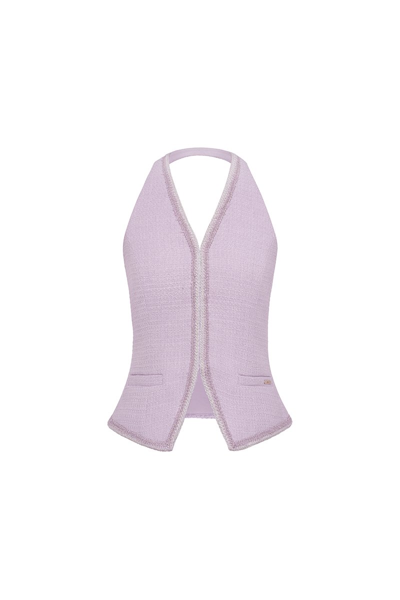 The Irene V-Neckline Tailored Vest is a refined take on modern femininity. Crafted from high-quality tweed, it features a halter neckline that frames your shoulders beautifully, while the trimmed borders add a sleek, polished edge. The defined waist and V-hem create a flattering silhouette that subtly enhances your curves. Finished with functional welt pockets and a long-line cut, Irene perfectly balances sophistication and structure — a timeless layering piece that elevates any look.