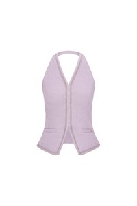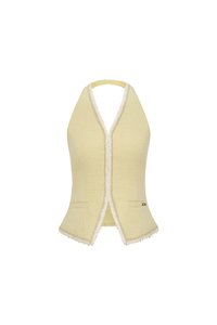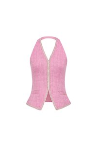 The Irene V-Neckline Tailored Vest is a refined take on modern femininity. Crafted from high-quality tweed, it features a halter neckline that frames your shoulders beautifully, while the trimmed borders add a sleek, polished edge. The defined waist and V-hem create a flattering silhouette that subtly enhances your curves. Finished with functional welt pockets and a long-line cut, Irene perfectly balances sophistication and structure — a timeless layering piece that elevates any look.