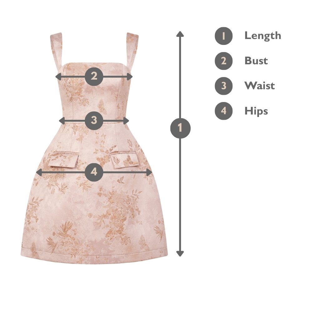 Kara is a structured mini with clean lines and subtle texture. The straight neckline frames the collarbones neatly, while the fitted bodice creates a defined upper silhouette. Crafted in soft jacquard with a smocked back, it stays comfortable without losing shape. Finished with adjustable straps and pockets for everyday practicality.