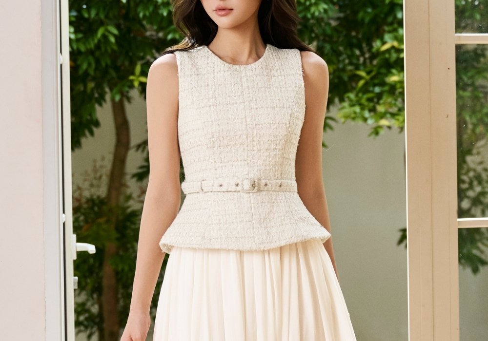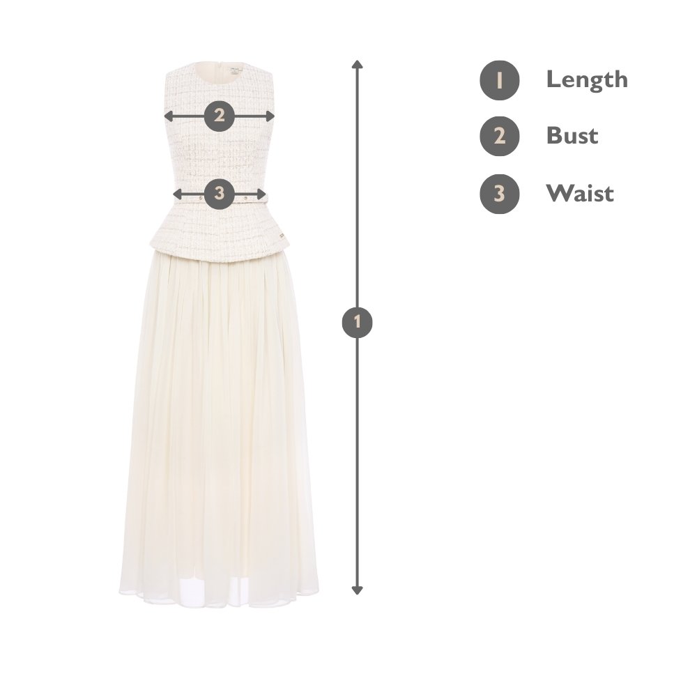 Liz pairs a structured tweed bodice with a flowing chiffon skirt for contrast in both texture and movement. The peplum waist subtly defines the shape, while the padded bust and detachable belt offer support and styling flexibility. Finished with a clean back zip, Liz is designed to move effortlessly while maintaining a refined, put-together look.