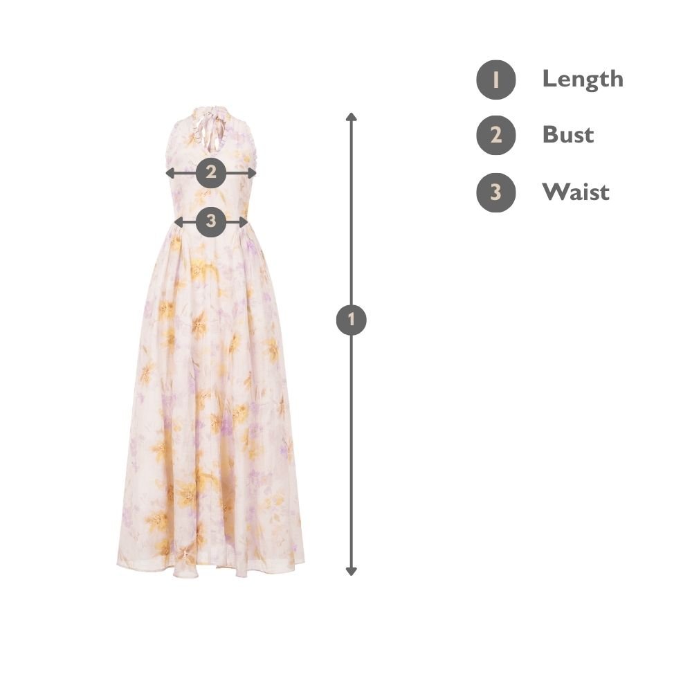 Maisie is a halter maxi dress designed to create a refined, feminine silhouette with ease. The halter neckline draws focus upward, while a cinched waist defines the figure before flowing into a soft flared skirt.The flared skirt creates fluid movement as you walk, giving the dress its soft, expressive character. Finished with a ribbon tie at the back and padded bust for fuss free wear, Maisie is made for weddings, celebrations, and moments that call for quiet confidence.