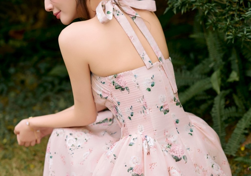 Monroe Halter Pintuck Midi Dress in Crepe Pink Floral Bouquet