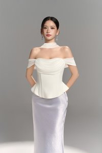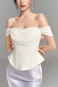 The Neve Soft Corset Drape Top with Sash blends soft femininity with modern structure. Designed with a draped off-shoulder neckline, it frames your collarbones while adding an elegant, fluid touch. The flared waist introduces an avant-garde element, contrasted by the defined V-waistline that creates the illusion of a slimmer figure. Subtle boning gives the top its shape and holds your form without restriction, while the padded bust ensures fuss-free wear. Effortlessly chic yet distinctly refined, Neve is a statement piece that elevates any outfit.
