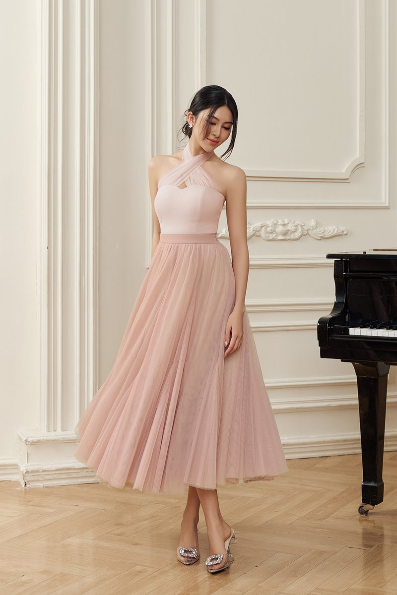 The Pirouette Midi Tulle Skirt in Blushed Petal is made of 3 layers of tulle in Blush, followed by 1 layer of tulle in Cream and inner lining in Champagne color