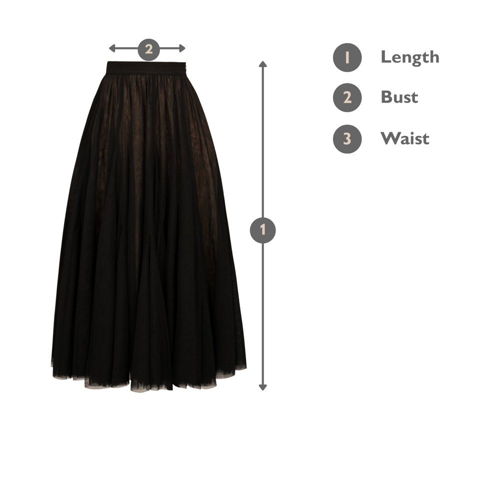 Designed with a high-waisted fit, it pairs effortlessly with both cropped and long-lined tops. The two-toned tulle adds a touch of lightness and dimension, elevating its ethereal appeal. Featuring a side invisible zipper for easy access, this keepsake skirt is as practical as it is stunning.