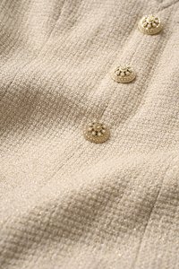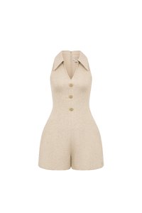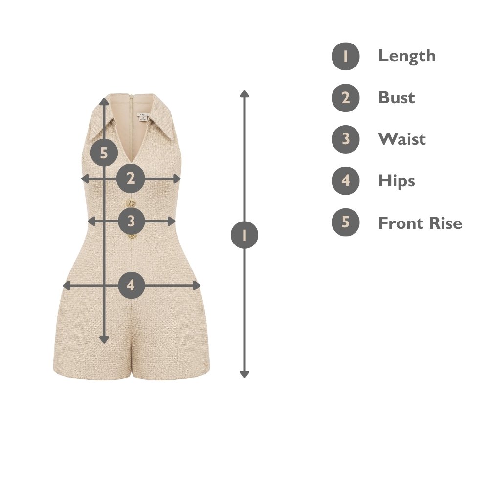 The Vienna V-Neckline Romper is a modern power piece that balances structure and charm. Designed with a bold accentuated collar and halter neckline, it draws attention to your shoulders and collarbones effortlessly. The cinched waist flatters your figure, while intricate gold buttons add a refined touch. Made from high-quality tweed for a polished finish, it’s completed with functional pockets and a clean invisible back zipper. Perfect for days when you want to look chic with minimal effort.