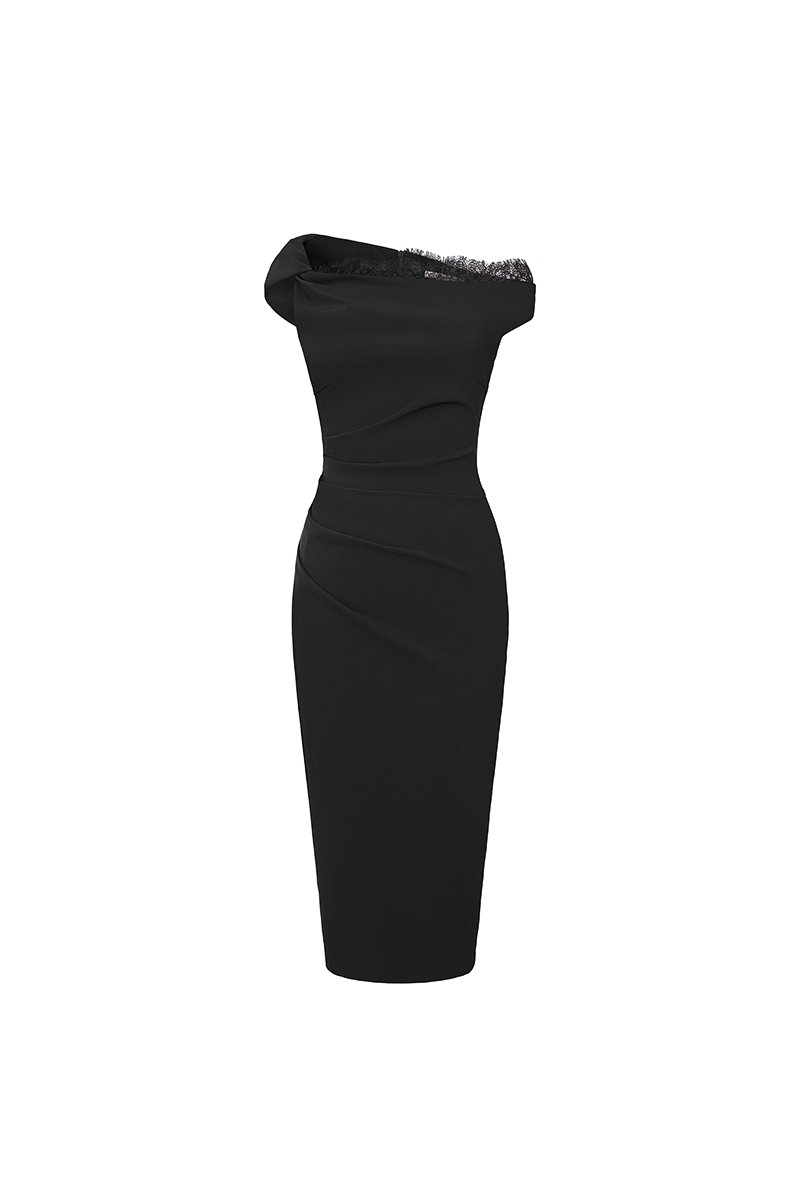 Designed to flatter from every angle, the Ysée Padded Asymmetrical Ruched Pencil Dress brings a touch of drama to a classic silhouette. The asymmetrical neckline adds modern interest, while the delicate lace insert softens the look with a hint of romance. A ruched waist gently skims over the midsection and enhances your curves, flowing into a sleek pencil skirt that hugs the figure without feeling restrictive. Finished with a back slit for ease of movement and a padded bust for fuss-free wear, Ysée is an elegant option for date nights, formal dinners, and occasions where you want to feel confidently polished.